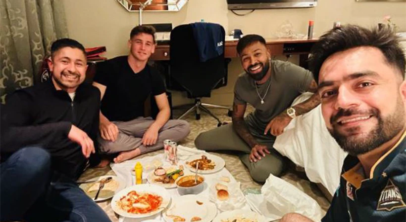 ഇപ്പോള് റാഷിദ് ഖാന് ഇന്സ്റ്റഗ്രാമില് പങ്കുവച്ച ഒരു ഫോട്ടായാണ് വൈറലായിരിക്കുന്നത്. അത്താഴത്തില് പങ്കുകൊള്ളാന് റാഷിദിനും നൂറിനുമൊപ്പം ഹാര്ദിക്കുമുണ്ടായിരുന്നു. ഹാര്ദിക്കിനൊപ്പം ഇരിക്കുന്ന ചിത്രമാണ് സോഷ്യല് മീഡിയ ഏറ്റെടുത്തിരിക്കുന്നത്. ക്യാപ്റ്റനൊപ്പമാണ് ഇന്നത്തെ അത്താഴമെന്നും ഞങ്ങള്ക്കൊപ്പം ഇരുന്നതില് സന്തോഷമുണ്ടെന്നും റാഷിദ് കുറിച്ചിട്ടു. ഹാര്ദിക് പോസ്റ്റിന് മറുപടിയും അയച്ചിട്ടുണ്ട്. ചിത്രം വൈറലായതോടെ ഹാര്ദിക് ഒരു വലിയ മനസിന് ഉടമയാണെന്നാണ് സോഷ്യല് മീഡിയയും പറയുന്നു.