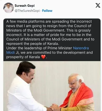 പ്രധാനമന്ത്രി നരേന്ദ്രമോദിയുടെ നേതൃത്വത്തിനു കീഴില്, കേരളത്തിന്റെ വികസനത്തിനും ഐശ്വര്യത്തിനും വേണ്ടി പ്രവർത്തിക്കാൻ ഞങ്ങളെല്ലാം പ്രതിബദ്ധരായിരിക്കും. മന്ത്രിസഭയില് നിന്നും രാജിവെക്കുന്നു എന്ന തരത്തില് ഏതാനും മീഡിയകളില് വന്നത് തികച്ചും തെറ്റാണെന്നും, മന്ത്രിയായി തുടരുമെന്നും സുരേഷ് ഗോപി കുറിപ്പില് സൂചിപ്പിച്ചു.